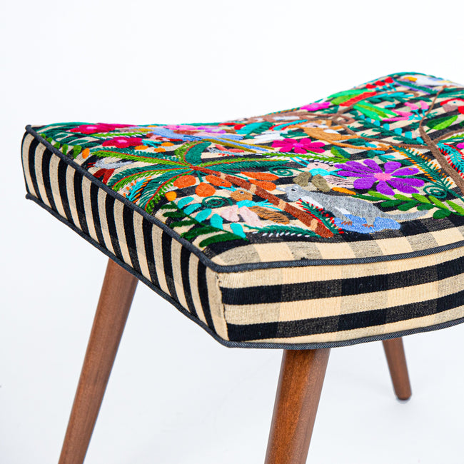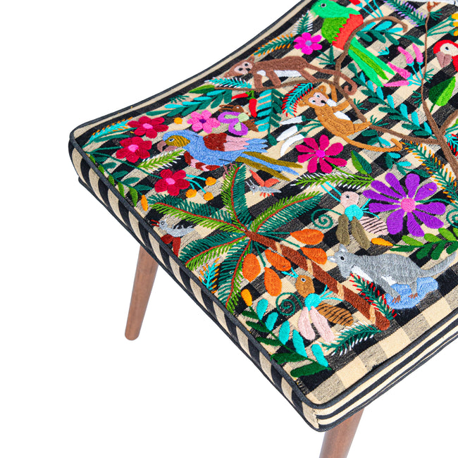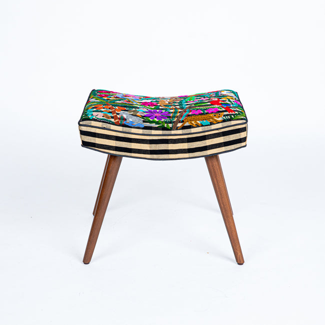 Embrace the essence of mid-century design with the Daria stool, featuring gentle curved lines and tapered legs. It showcases a joyful embroidery of fauna and flora by master artisan Mary Hernandez on a checkered hand loomed fabric from Chiapas, adding a touch of nature's beauty to your home.