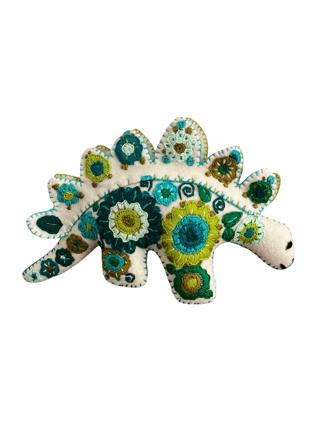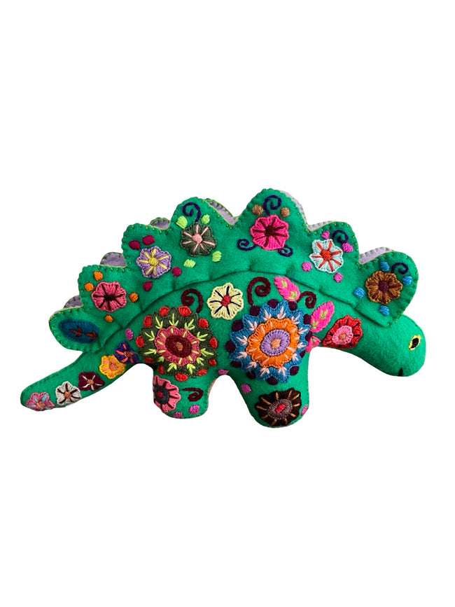 Handmade joyful embroidered felt stegosaurus from Chiapas with custom sherbet colors.  Each animal is one of a kind and may slightly vary in pattern and design.   12” by 7” Vew more