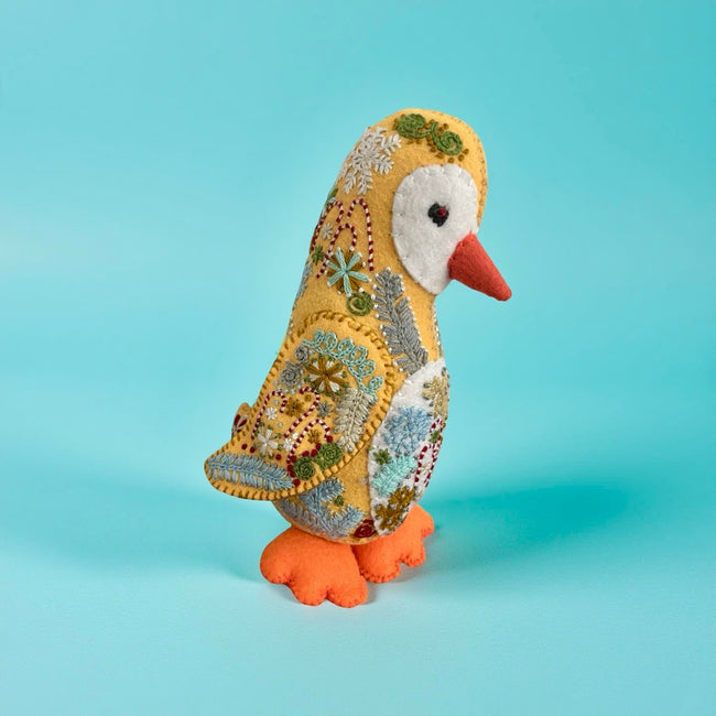 Handmade joyful embroidered felt penguin from Chiapas with joyful and intricate holiday pattern. .